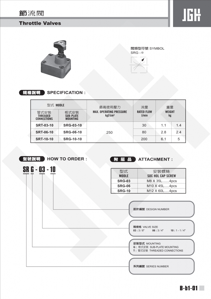 JGH節(jié)流閥常規(guī)型號參考:SRG-03-10 , SRG-06-10 , SRG-10-10 , SRT-03-10 , SRT-06-10 , SRT-10-10