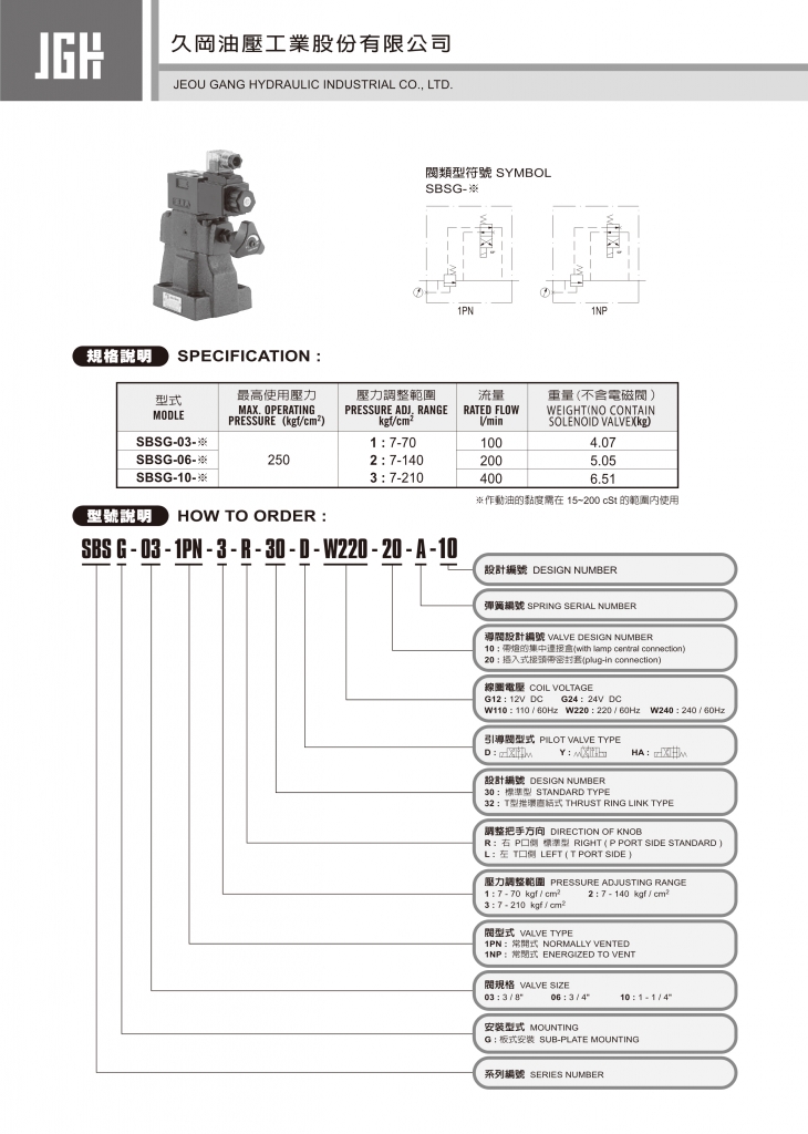JGH低噪音型電磁控制溢流閥常規(guī)型號(hào)參考:SBSG-03-1NP-1-L , SBSG-03-1NP-1-R , SBSG-03-1NP-2-L , SBSG-03-1NP-2-R , SBSG-03-1NP-3-L , SBSG-03-1NP-3-R , SBSG-03-1PN-1-L , SBSG-03-1PN-1-R , SBSG-03-1PN-2-L , SBSG-03-1PN-2-R , SBSG-03-1PN-3-L , SBSG-03-1PN-3-R , SBSG-06-1NP-1-L , SBSG-06-1NP-1-R , SBSG-06-1NP-2-L , SBSG-06-1NP-2-R , SBSG-06-1NP-3-L , SBSG-06-1NP-3-R , SBSG-06-1PN-1-L , SBSG-06-1PN-1-R , SBSG-06-1PN-2-L , SBSG-06-1PN-2-R , SBSG-06-1PN-3-L , SBSG-06-1PN-3-R , SBSG-10-1NP-1-L , SBSG-10-1NP-1-R , SBSG-10-1NP-2-L , SBSG-10-1NP-2-R , SBSG-10-1NP-3-L , SBSG-10-1NP-3-R , SBSG-10-1PN-1-L , SBSG-10-1PN-1-R , SBSG-10-1PN-2-L , SBSG-10-1PN-2-R , SBSG-10-1PN-3-L , SBSG-10-1PN-3-R