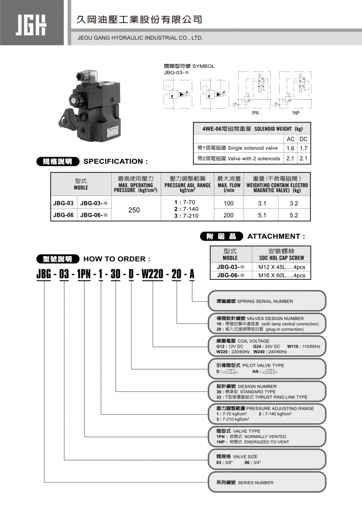 規(guī)格說明 型式 最高使用壓力 kgf/cm2 壓力調(diào)整範(fàn)圍 kgf/cm2 最大流量 l/min 重量(不含電磁閥) kg JBG-03 JBG-03- ※ 250 1 :?7-70 2 :?7-140 3 :?7-210 100 3.1 3.2 JBG-06 JBG-06-※ 200 5.1 5.2 JGH先導(dǎo)式溢流閥常規(guī)型號參考:JBG-03-1NP-1 , JBG-03-1NP-2 , JB