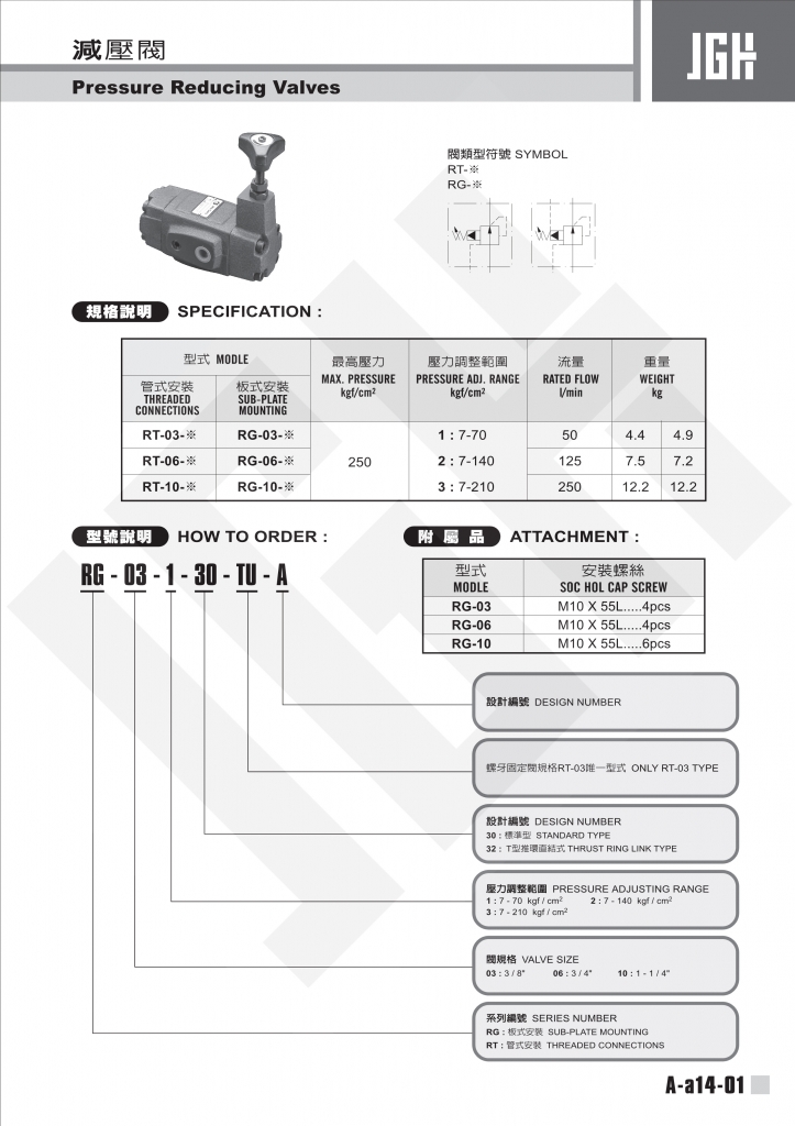 JGH減壓閥常規(guī)型號參考:RG-03-1 , RG-03-2 , RG-03-3 , RG-06-1 , RG-06-2 , RG-06-3 , RG-10-1 , RG-10-2 , RG-10-3 , RT-03-1 , RT-03-2 , RT-03-3 , RT-06-1 , RT-06-2 , RT-06-3 , RT-10-1 , RT-10-2 , RT-10-3