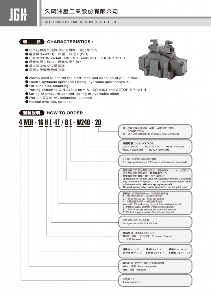 • WEH型方向閥是帶電-液操作的方向滑閥,用以控制液流的開(kāi)啟、停止和方向。