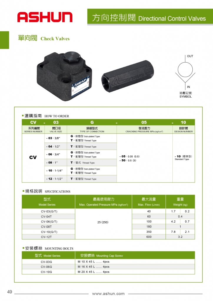 ASHUN油順方向控制閥 CV系列單向閥