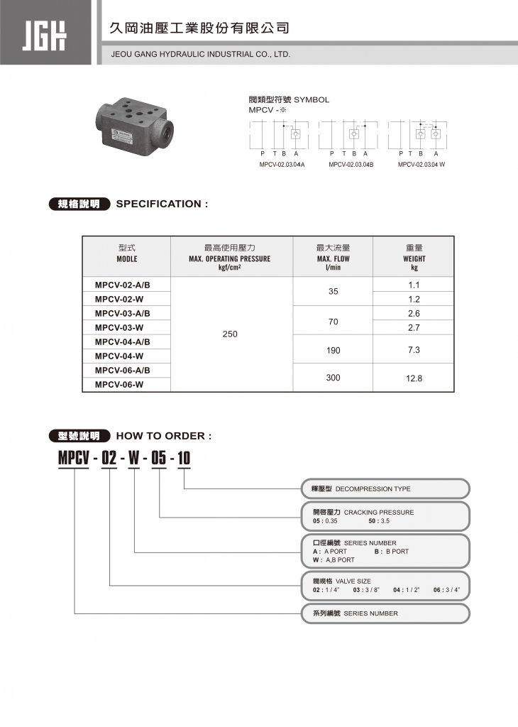 規(guī)格說明 型式 最高使用壓力 kgf/cm2 最大流量 l/min 重量 kg MPCV-02-A/B 250 35 1.1 MPCV-02-W 1.2 MPCV-03-A/B 70 2.6 MPCV-03-W 2.7 MPCV-04-A/B 190 7.3 MPCV-04-W MPCV-06-A/B 300 12.8 MPCV-06-W JGH久岡疊加式控制閥部分常規(guī)型號參考:MPCV-02-A