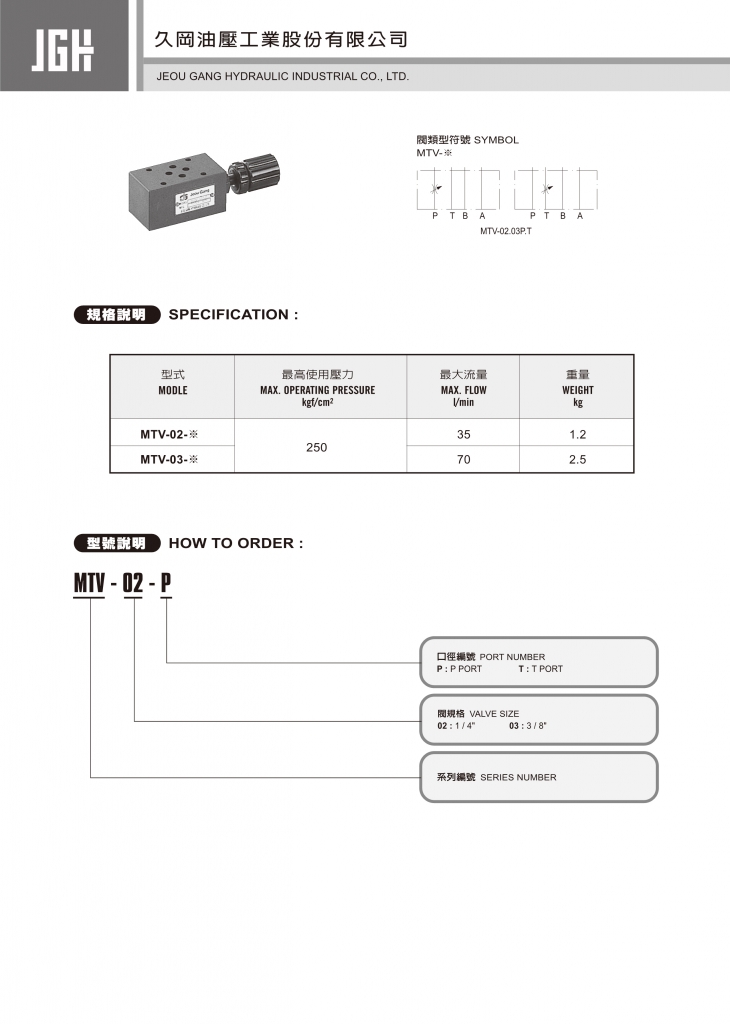 JGH久岡疊加式控制閥部分常規(guī)型號參考:MTV-02-P , MTV-02-T , MTV-03-P , MTV-03-T