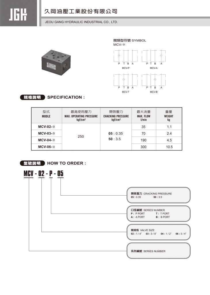 規(guī)格說明 型式 最高使用壓力 kgf/cm2 CHACKING PRESSURE kgf/cm2 最大流量 l/min 重量 kg MCV-02-※ 250 05:0.35 50:3.5 35 1.1 MCV-03-※ 70 2.4 MCV-04-※ 190 4.5 MCV-06-※ 300 10.5 JGH疊加式單向閥部分常規(guī)型號參考:MCV-02-A-05 , MCV-02-A-50 , MC