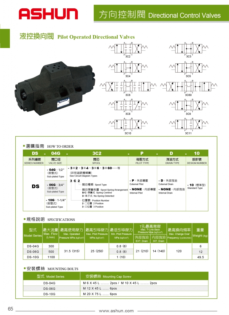 ASHUN液控?fù)Q向閥部分常規(guī)型號(hào)參考:DS-04G-2B2-10 , DS-04G-2B2-D-10 , DS-04G-2B2-P-10 , DS-04G-2B2-P-D-10 , DS-04G-2B4-10 , DS-04G-2B4-D-10 , DS-04G-2B4-P-10 , DS-04G-2B4-P-D-10 , DS-04G-2B6-10 , DS-04G-2B6-D-10 , DS-04G-2B6-P-10 , DS-04G-2B6-P-D-10 , DS-04G-3C2-10 , DS-04G-3C2-D-10 , DS-04G-3C2-P-10 , DS-04G-3C2-P-D-10 , DS-04G-3C4-10 , DS-04G-3C4-D-10 , DS-04G-3C4-P-10 , DS-04G-3C4-P-D-10 , DS-04G-3C6-10 , DS-04G-3C6-D-10 , DS-04G-3C6-P-10 , DS-04G-3C6-P-D-10 , DS-04G-3D2-10 , DS-04G-3D2-D-10 , DS-04G-3D2-P-10 , DS-04G-3D2-P-D-10 , DS-04G-3D4-10 , DS-04G-3D4-D-10 , DS-04G-3D4-P-10 , DS-04G-3D4-P-D-10 , DS-04G-3D6-10 , DS-04G-3D6-D-10 , DS-04G-3D6-P-10 , DS-04G-3D6-P-D-10 , DS-06G-2B2-10 , DS-06G-2B2-D-10 , DS-06G-2B2-P-10 , DS-06G-2B2-P-D-10 , DS-06G-2B4-10 , DS-06G-2B4-D-10 , DS-06G-2B4-P-10 , DS-06G-2B4-P-D-10 , DS-06G-2B6-10 , DS-06G-2B6-D-10 , DS-06G-2B6-P-10 , DS-06G-2B6-P-D-10 , DS-06G-3C2-10 , DS-06G-3C2-D-10 , DS-06G-3C2-P-10 , DS-06G-3C2-P-D-10 , DS-06G-3C4-10 , DS-06G-3C4-D-10 , DS-06G-3C4-P-10 , DS-06G-3C4-P-D-10 , DS-06G-3C6-10 , DS-06G-3C6-D-10 , DS-06G-3C6-P-10 , DS-06G-3C6-P-D-10 , DS-06G-3D2-10 , DS-06G-3D2-D-10 , DS-06G-3D2-P-10 , DS-06G-3D2-P-D-10 , DS-06G-3D4-10 , DS-06G-3D4-D-10 , DS-06G-3D4-P-10 , DS-06G-3D4-P-D-10 , DS-06G-3D6-10 , DS-06G-3D6-D-10 , DS-06G-3D6-P-10 , DS-06G-3D6-P-D-10 , DS-10G-2B2-10 , DS-10G-2B2-D-10 , DS-10G-2B2-P-10 , DS-10G-2B2-P-D-10 , DS-10G-2B4-10 , DS-10G-2B4-D-10 , DS-10G-2B4-P-10 , DS-10G-2B4-P-D-10 , DS-10G-2B6-10 , DS-10G-2B6-D-10 , DS-10G-2B6-P-10 , DS-10G-2B6-P-D-10 , DS-10G-3C2-10 , DS-10G-3C2-D-10 , DS-10G-3C2-P-10 , DS-10G-3C2-P-D-10 , DS-10G-3C4-10 , DS-10G-3C4-D-10 , DS-10G-3C4-P-10 , DS-10G-3C4-P-D-10 , DS-10G-3C6-10 , DS-10G-3C6-D-10 , DS-10G-3C6-P-10 , DS-10G-3C6-P-D-10 , DS-10G-3D2-10 , DS-10G-3D2-D-10 , DS-10G-3D2-P-10 , DS-10G-3D2-P-D-10 , DS-10G-3D4-10 , DS-10G-3D4-D-10 , DS-10G-3D4-P-10 , DS-10G-3D4-P-D-10 , DS-10G-3D6-10 , DS-10G-3D6-D-10 , DS-10G-3D6-P-10 , DS-10G-3D6-P-D-10