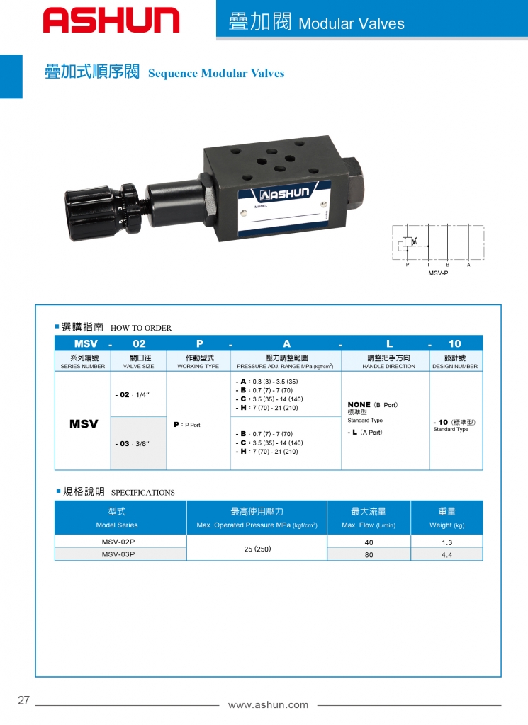ASHUN疊加式順序閥常規(guī)型號(hào)參考:MSV-02P-A-10 , MSV-02P-A-L-10 , MSV-02P-B-10 , MSV-02P-B-L-10 , MSV-02P-C-10 , MSV-02P-C-L-10 , MSV-02P-H-10 , MSV-02P-H-L-10 , MSV-03P-B-10 , MSV-03P-B-L-10 , MSV-03P-C-10 , MSV-03P-C-L-10 , MSV-03P-H-10 , MSV-03P-H-L-10