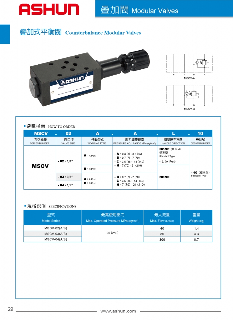ASHUN疊加式平衡閥常規(guī)型號參考:MSCV-02A-A-10 , MSCV-02A-A-L-10 , MSCV-02A-B-10 , MSCV-02A-B-L-10 , MSCV-02A-C-10 , MSCV-02A-C-L-10 , MSCV-02A-H-10 , MSCV-02A-H-L-10 , MSCV-02B-A-10 , MSCV-02B-A-L-10 , MSCV-02B-B-10 , MSCV-02B-B-L-10 , MSCV-02B-C-10 , MSCV-02B-C-L-10 , MSCV-02B-H-10 , MSCV-02B-H-L-10 , MSCV-03A-B-10 , MSCV-03A-C-10 , MSCV-03A-H-10 , MSCV-03B-B-10 , MSCV-03B-C-10 , MSCV-03B-H-10 , MSCV-04A-B-10 , MSCV-04A-C-10 , MSCV-04A-H-10 , MSCV-04B-B-10 , MSCV-04B-C-10 , MSCV-04B-H-10