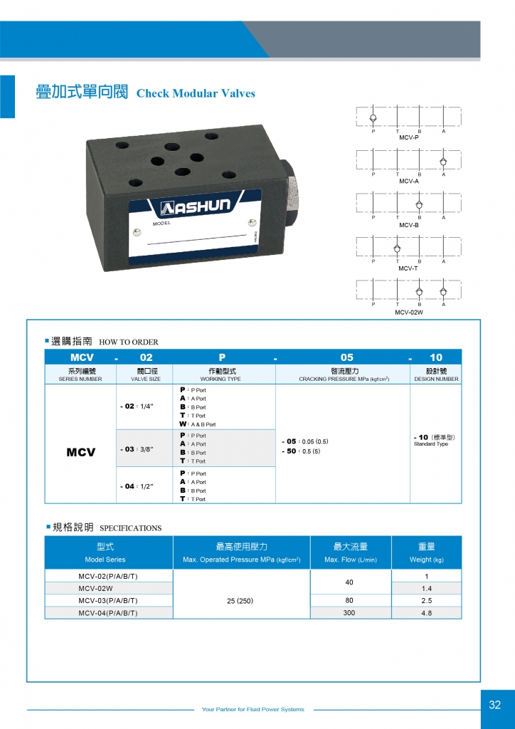 ASHUN疊加式單向閥常規(guī)型號參考:MCV-02A-05-10 , MCV-02A-50-10 , MCV-02B-05-10 , MCV-02B-50-10 , MCV-02P-05-10 , MCV-02P-50-10 , MCV-02T-05-10 , MCV-02T-50-10 , MCV-02W-05-10 , MCV-02W-50-10 , MCV-03A-05-10 , MCV-03A-50-10 , MCV-03B-05-10 , MCV-03B-50-10 , MCV-03P-05-10 , MCV-03P-50-10 , MCV-03T-05-10 , MCV-03T-50-10 , MCV-04A-05-10 , MCV-04A-50-10 , MCV-04B-05-10 , MCV-04B-50-10 , MCV-04P-05-10 , MCV-04P-50-10 , MCV-04T-05-10 , MCV-04T-50-10