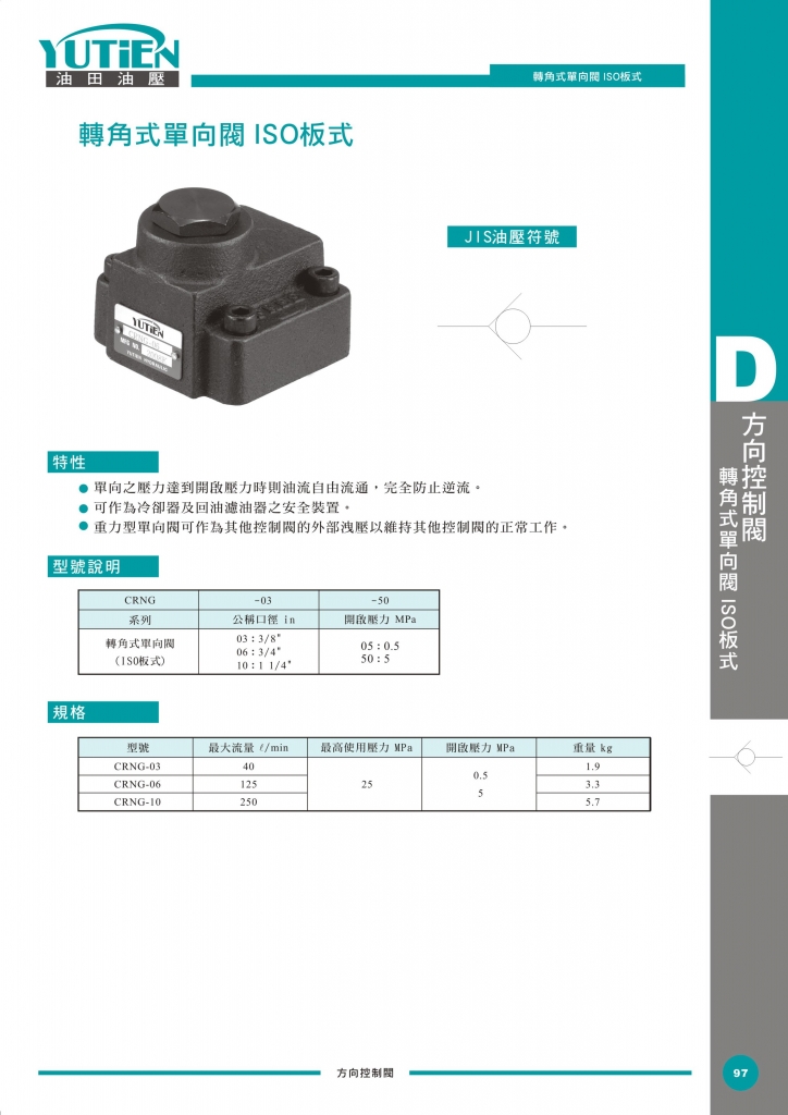 YUTIEN油田方向控制閥 CRNG系列轉角式單向閥 ISO板式