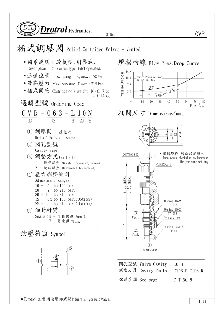 DTL插式調(diào)壓閥部分常規(guī)型號(hào)參考:CVR-063-K10N , CVR-063-K10V , CVR-063-K1SN , CVR-063-K1SV , CVR-063-K20N , CVR-063-K20V , CVR-063-K2SN , CVR-063-K2SV , CVR-063-K30N , CVR-063-K30V , CVR-063-L10N , CVR-063-L10V , CVR-063-L1SN , CVR-063-L1SV , CVR-063-L20N , CVR-063-L20V , CVR-063-L2SN , CVR-063-L2SV , CVR-063-L30N , CVR-063-L30V ,
