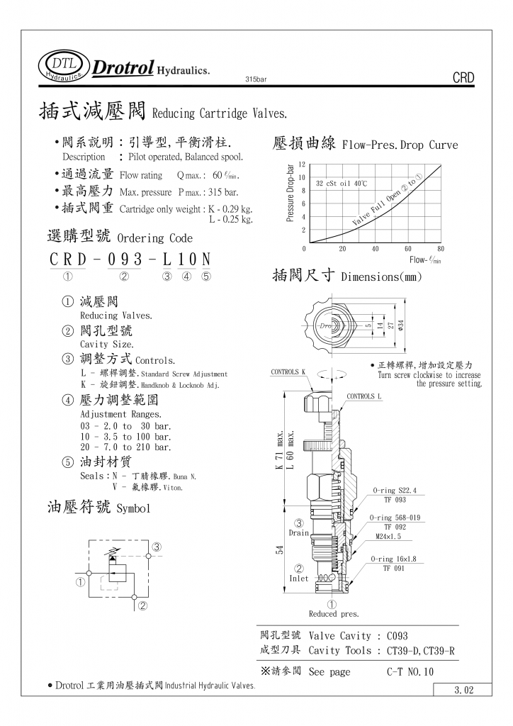DTL插式減壓閥部分常規(guī)型號參考:CRD-093-K03N , CRD-093-K03V , CRD-093-K10N , CRD-093-K10V , CRD-093-K20N , CRD-093-K20V , CRD-093-L03N , CRD-093-L03V , CRD-093-L10N , CRD-093-L10V , CRD-093-L20N , CRD-093-L20V ,