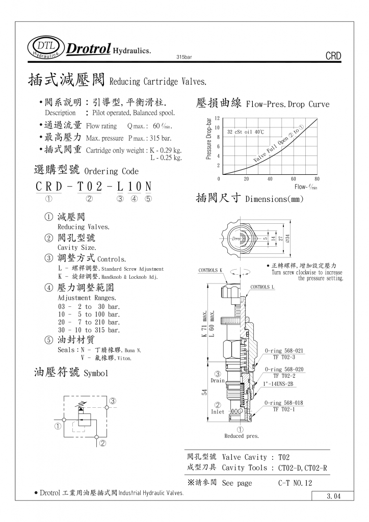 DTL插式減壓閥部分常規(guī)型號參考:CRD-T02-K03N , CRD-T02-K03V , CRD-T02-K10N , CRD-T02-K10V , CRD-T02-K20N , CRD-T02-K20V , CRD-T02-K30N , CRD-T02-K30V , CRD-T02-L03N , CRD-T02-L03V , CRD-T02-L10N , CRD-T02-L10V , CRD-T02-L20N , CRD-T02-L20V , CRD-T02-L30N , CRD-T02-L30V ,