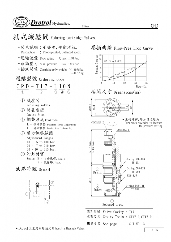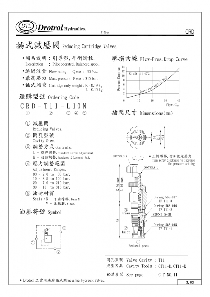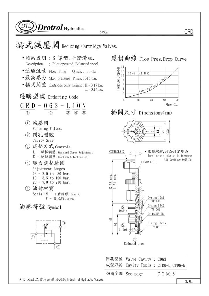 DTL插式減壓閥部分常規(guī)型號參考:CRD-063-K03N , CRD-063-K03V , CRD-063-K10N , CRD-063-K10V , CRD-063-K20N , CRD-063-K20V , CRD-063-L03N , CRD-063-L03V , CRD-063-L10N , CRD-063-L10V , CRD-063-L20N , CRD-063-L20V ,