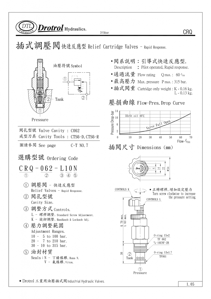 DTL插式調壓閥部分常規(guī)型號參考:CRQ-062-K10N , CRQ-062-K10V , CRQ-062-K20N , CRQ-062-K20V , CRQ-062-K30N , CRQ-062-K30V , CRQ-062-L10N , CRQ-062-L10V , CRQ-062-L20N , CRQ-062-L20V , CRQ-062-L30N , CRQ-062-L30V ,