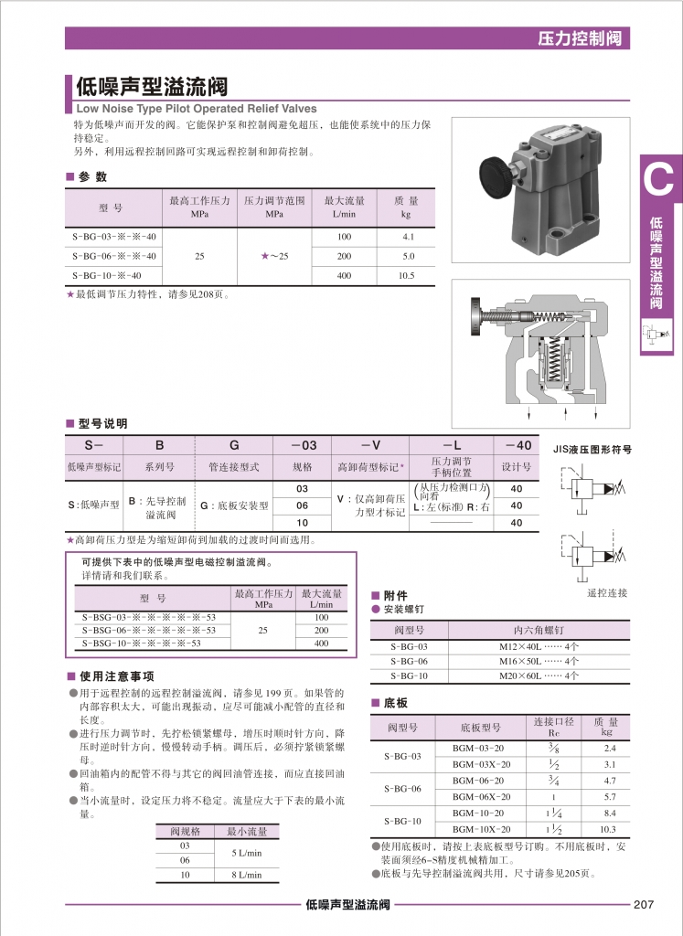 本元件為低噪聲溢流閥,用于保護(hù)油泵和系統(tǒng)安全及控制系統(tǒng)壓力,還可通過遙控口實(shí)現(xiàn)遙控,使油泵卸荷或加載。 型  號(hào) 最高使用壓力MPa 壓力調(diào)整范圍L/min 最大流量L/min 質(zhì) 量kg S-BG-03-※-※-40 25.0 注)※-25.0 100 4.1 S-BG-06-※-※-40 200 5.0 S-BG-10-※-40 400 10.5 YUKEN低噪音型溢流閥部分常規(guī)型號(hào)參考:SB