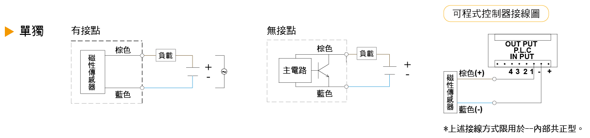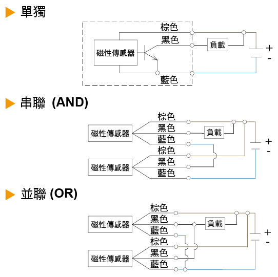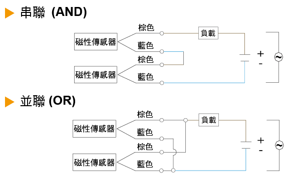 當二線式串連時,不能超過兩個磁性傳感器預定額度的內部降壓 (內部降壓:2.5 ~ 4V/per switch) 否則會導致負載的不動作。