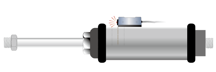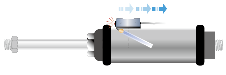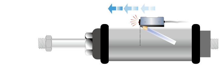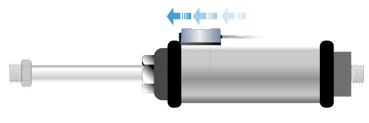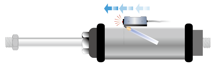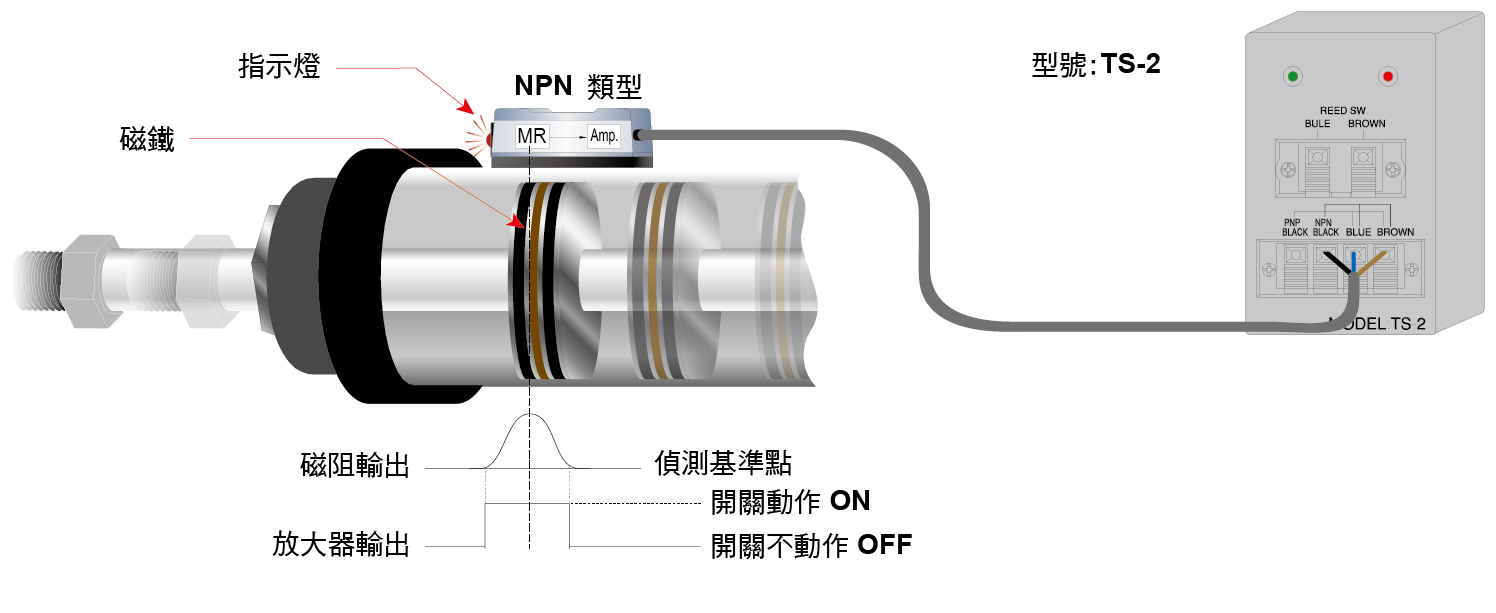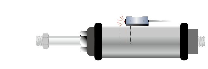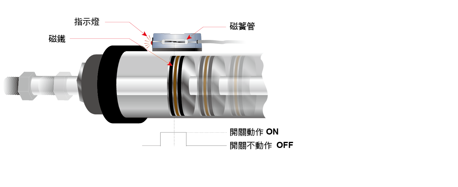 當氣壓缸動作,裝置在活塞內的磁鐵向磁性傳感器接近時,磁性傳感器內的磁簧管將會感應到磁場的變化,使磁簧管的接點閉合而導通電路。