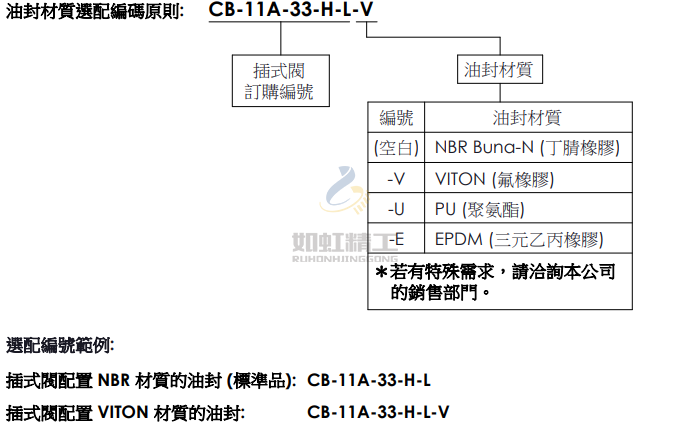 在一般標(biāo)準(zhǔn)的WINNER插裝閥以及WINNER電磁閥中,都是提供NBR材質(zhì)的油封.WINNER一共提供4種材質(zhì)供客戶選配.各系列提供的油封材質(zhì)可能有所不同,詳細(xì)請(qǐng)咨詢?nèi)绾缇?下圖將為您講解油封材質(zhì)選配及編碼原則: